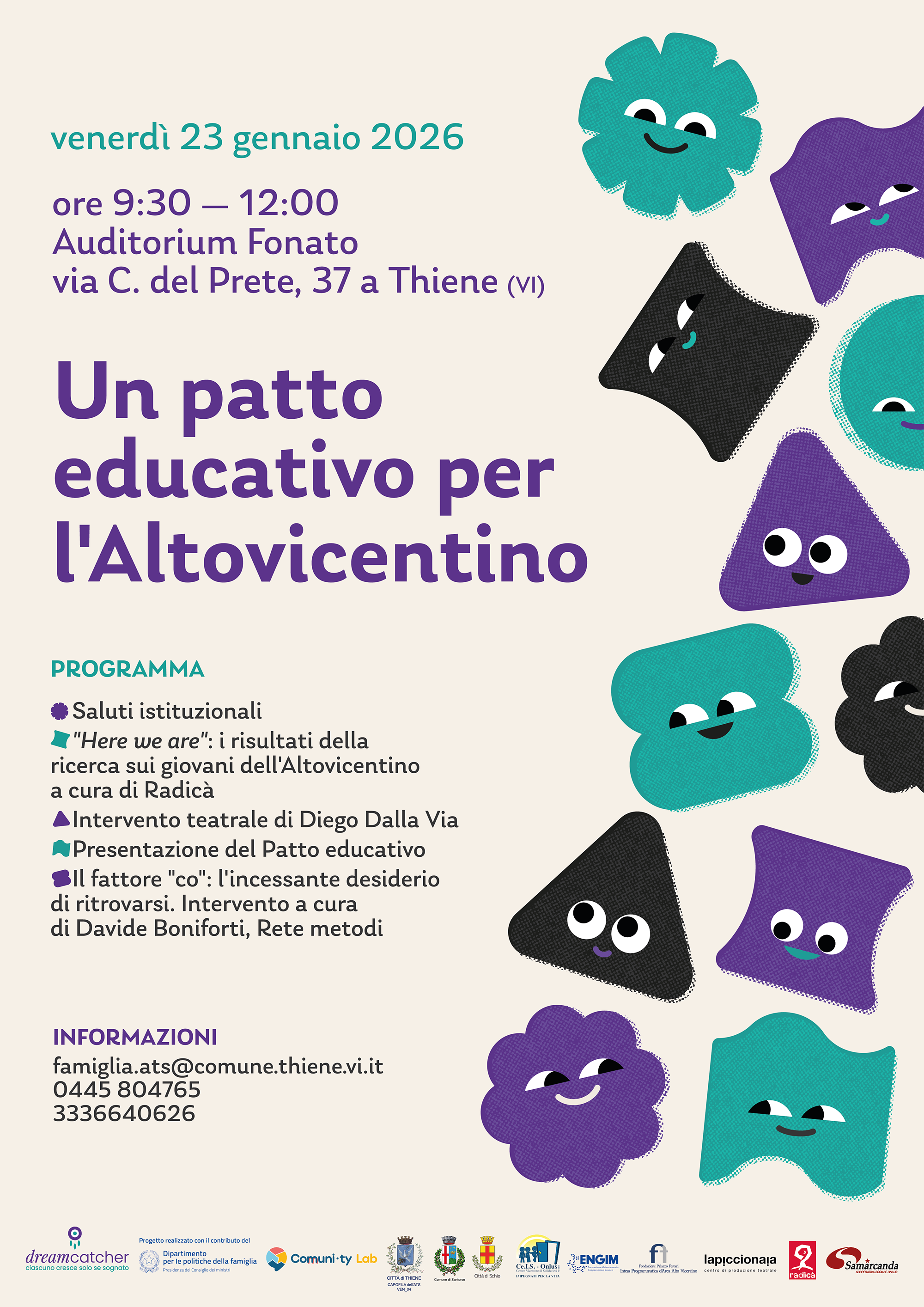 Sarà l’occasione per condividere quanto emerso dal percorso svolto tra il 2024 e il 2025 con amministratori, cittadini, docenti, giovani, ets all’interno del progetto “Dreamcatcher. Ciascuno cresce solo se sognato” – promosso dall’Ambito Territoriale Sociale di Thiene con la partnership di Engim Veneto, Engim Impresa Formativa, Cooperativa Samarcanda, Cooperativa Radicà, La Piccionaia e Fondazione Festari – che ha permesso di costruire insieme un “Patto Educativo per l’Altovicentino”.